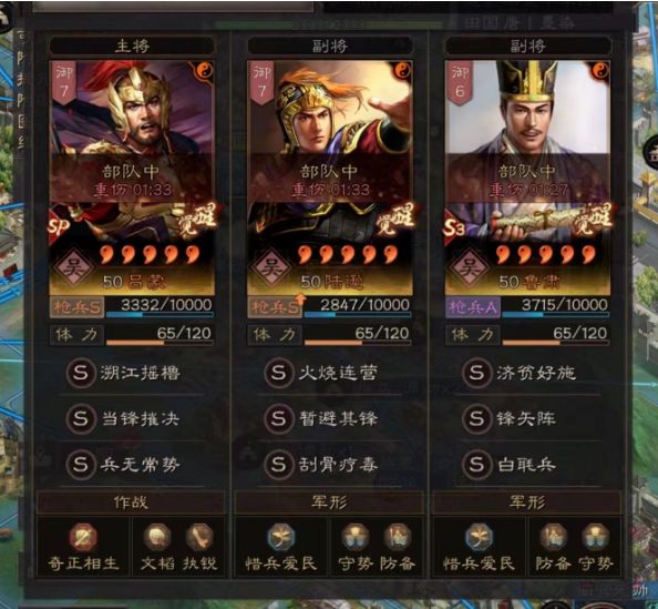 sp吕蒙:当锋摧决 兵无常势 (援助(必备)踩踏)陆逊:暂避其锋 刮骨疗毒 (枪宝物(必备))鲁肃:白毦兵 锋矢阵