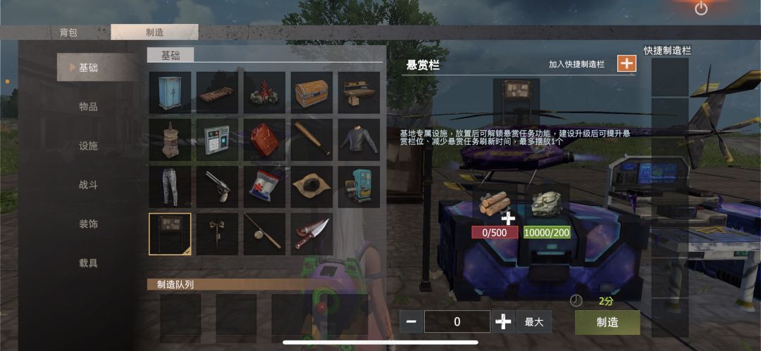 3.这里我们单独介绍行动基地专属设施,悬赏栏的制作,以及制作需要的500木头200石头,和功能!