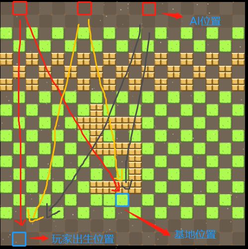 接下来我们就分析下AI策略:红色框为AI出生位置,每个AI都会计算AI与玩家基地及AI与玩家的2点见距离;选择最近的进行移动进攻。在玩家不动的情况下,一个AI选择攻击玩家;其余2个AI会选择直接攻击基地。实际上服务器会每毫秒检测1步骤,同时结合A星算法进行移动进攻。
