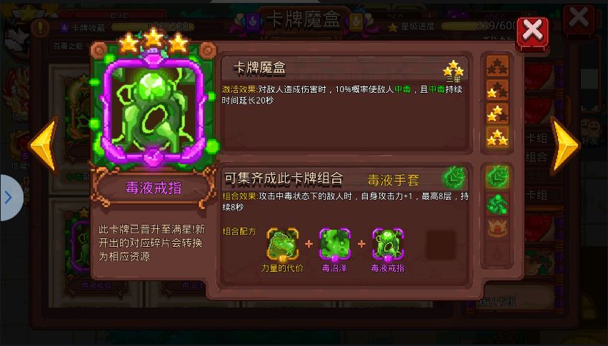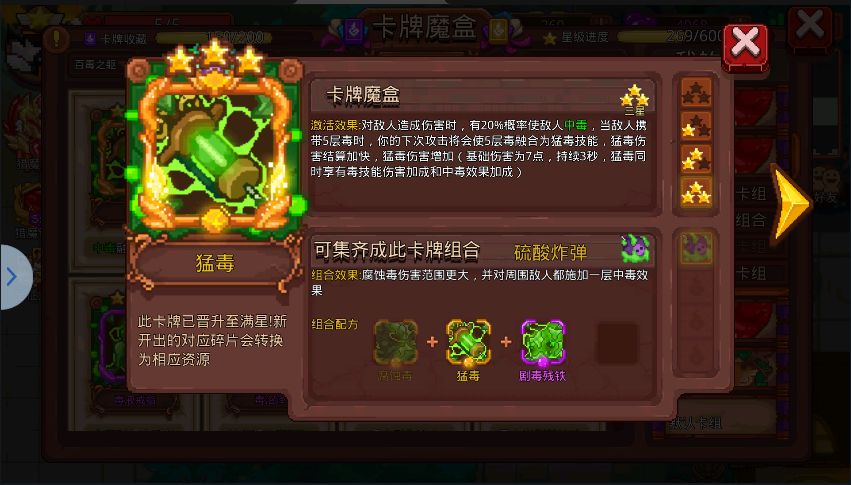 提示:卡牌中的概率都是分开计算,而不是叠加计算,比如说:你有两种卡,一张中毒为10%,一张为20%,那么攻击一次,中毒概率不是30%,而是先触发10%,再触发20%,是分开的。