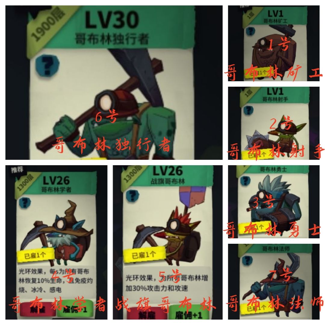 ▷❶号哥布林矿工:生命和防御很高,但攻击一般,拥有极快的生命恢复速度,每秒恢复20%HP。(适合新手)