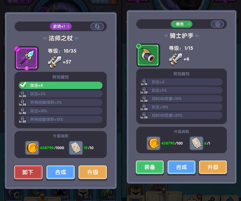 冒险少不了武器装备,勇者当然得配上好的圣剑~装备系统是冒险者们的重要养成环节之一,为大家提供各方面的属性加成。目前共有猎人、佣兵、法师、骑士四个系列,武器、戒指、手部、头饰、鞋子、衣服六个不同部位,加成都不一样,一定要注意属性。有些比较特别的属性,会随着等级的提升(使用升级券)解锁,诸如技能体积增大、对BOSS伤害加成,这类不可多得的属性不容错过哦。随着组队装备副本的开放,大家获取装备也会更加容易。具体的合成规则可以参考