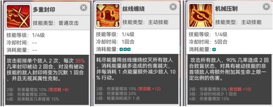 火发条人偶是一个功能性与输出并存的使魔,两个技能双aoe的同时也有着非常不错的功能性,主动技能「丝线缠绕」可以推条,主动技能「机械压制」可以致盲敌人的同时对存在被动技能的敌人可以造成额外伤害。在推图中会遇到很多带被动技能的使魔,因此火发条的输出还是非常给力的。在装备方面需要搭配一定的效果命中。