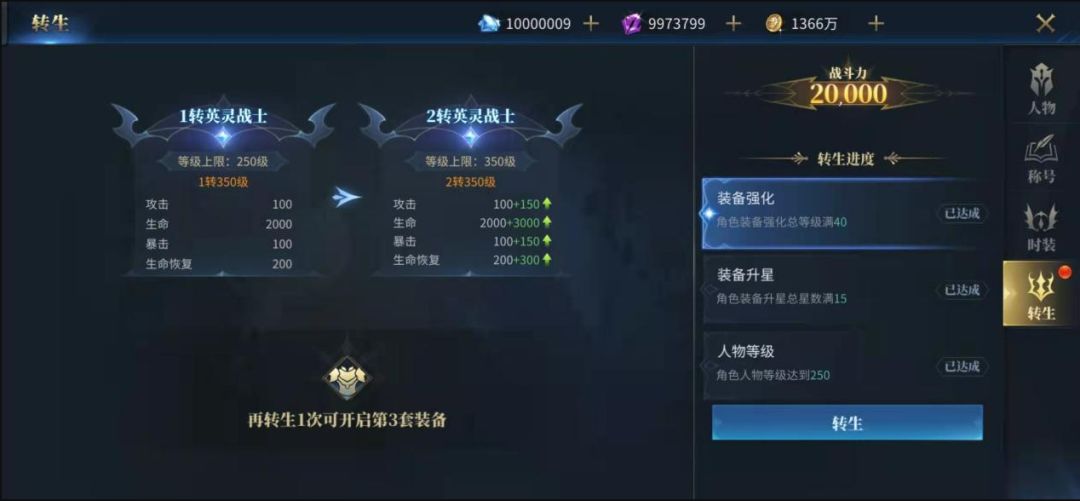 以战士为例,从0转英灵战士转生为1转英灵战士,当满足如下三个条件时,即可进行转生: