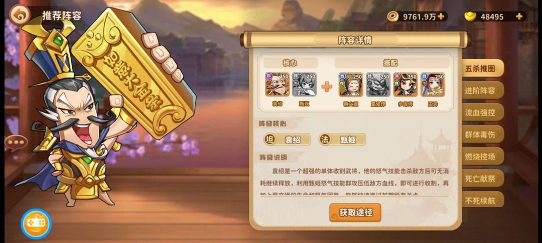 阵容说明:袁绍是一个超强的单体收割武将,他的怒气技能击杀敌方后可无消耗继续释放,利用甄姬怒气技能群攻压低敌方血线,即可进行收割,有更好的AOE武将也可以替换甄姬和王异,再加上蔡文姬的生命和怒气回复,能够快速推过前期所有关卡。