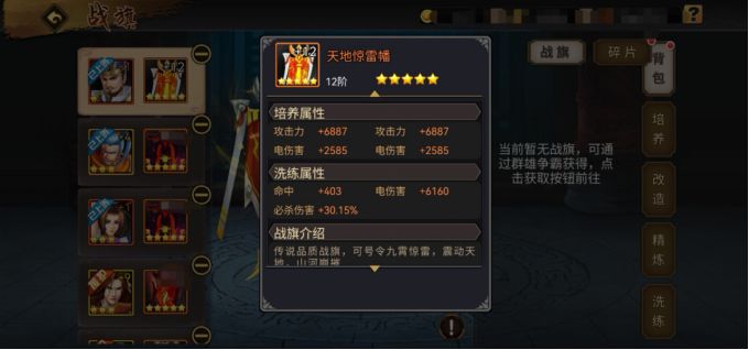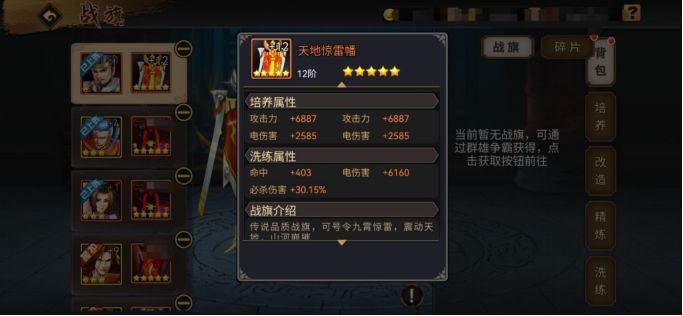 一.战旗的种类战旗优劣由高到低:橙色 > 紫色 > 蓝色三种品质,橙旗具备双基础属性和双旗面属性,紫色、蓝色只有单项,毋庸置疑,橙旗必然是玩家的首选。橙、紫战旗有冰、火、风、暴、电五种属性,蓝色战旗只有冰、风2种属性。玩家参与群雄争霸副本,占领城池结算时在城池排行榜前50名获得战旗碎片,通过碎片合成完整的战旗,其中橙色战旗(80碎片)、紫色战旗(40碎片)、蓝色战旗(20碎片)。战旗合成之后随机产生基础属性(攻击力、防御力、生命值3种)和副属性(对应的属性攻击或防御2种),以前的基础属性作用要远大于副属性,如今风水轮流转,今年到副属性家!