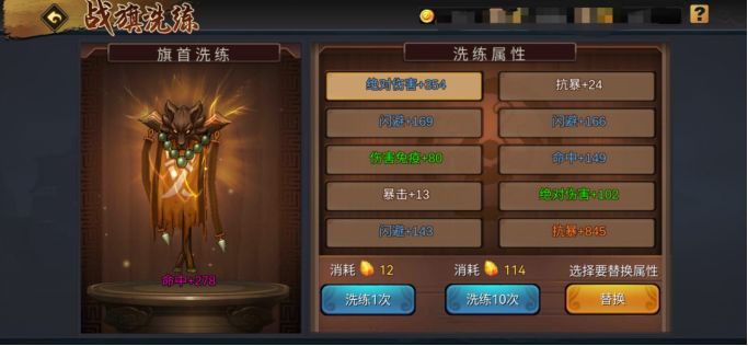 战旗2阶激活旗首,可洗练暴击、命中、闪避、抗暴、绝对伤害和伤害免疫六大常规属性。纯副本玩家,推荐洗练暴击,实战效果好,加的战力也多;对于热衷排位的玩家,则建议洗练命中、闪避优先。