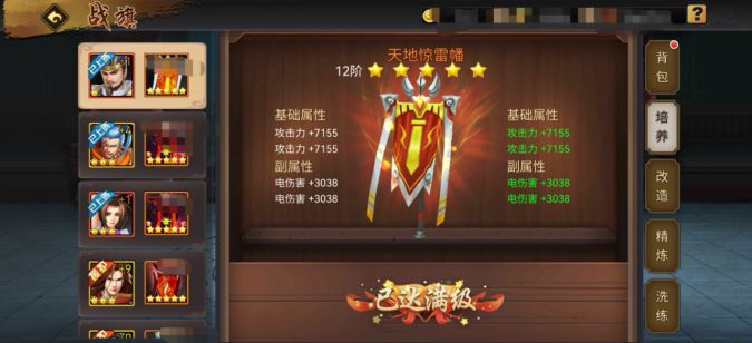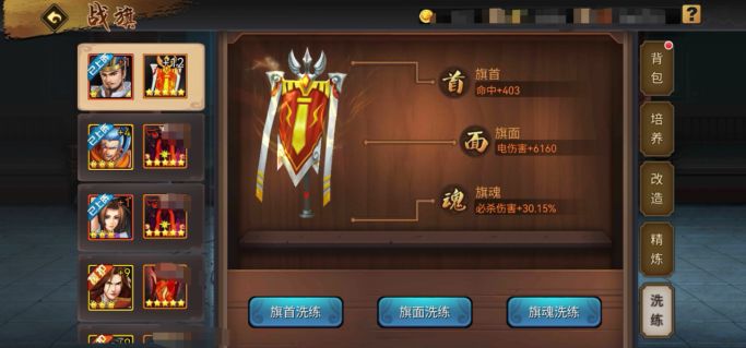 战旗4阶激活旗魂属性,可洗练出普攻、技能1/2/3伤害以及必杀伤害加成。大招输出能力高的武将,推荐旗魂洗炼必杀技伤害加成,而普通技能伤害突出的武将则建议洗练出对应的技能伤害加成,比如小张飞,旗魂必须是1技能伤害加成。总结