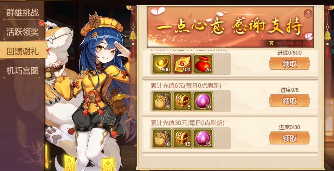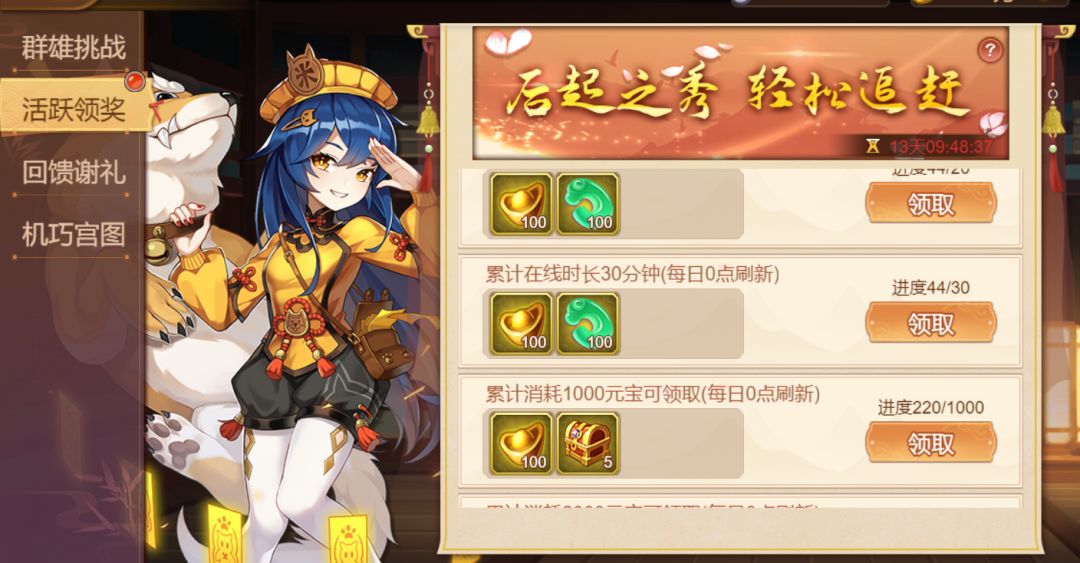 累计在线30分钟:元宝*100+功勋*100 (每日0点重置)