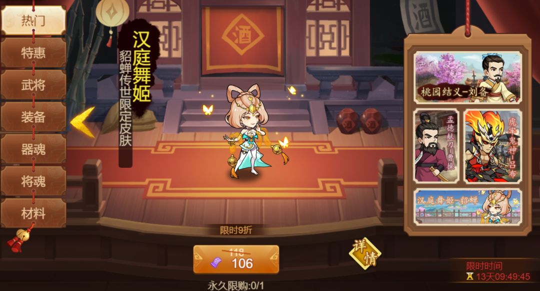 活动简介:活动期间,刘备、曹操、吕布、貂蝉系列皮肤限时折扣热销,不要错过哦!