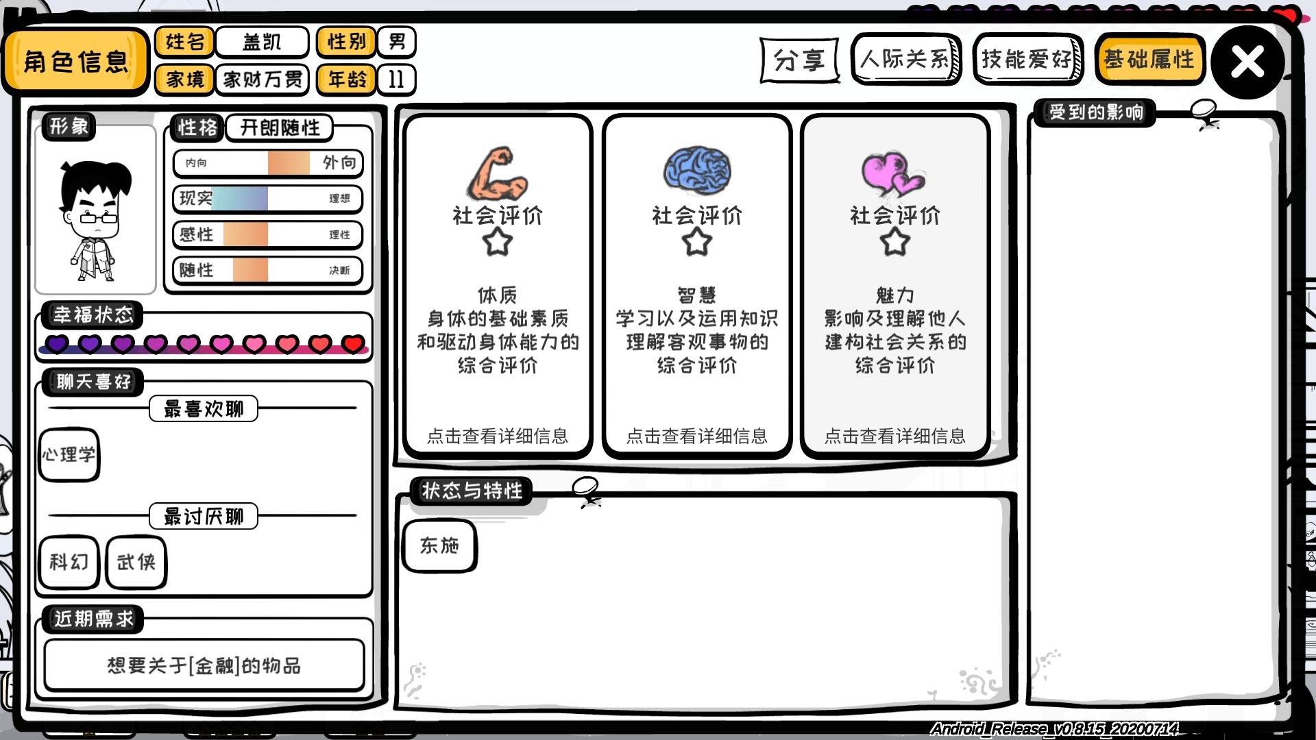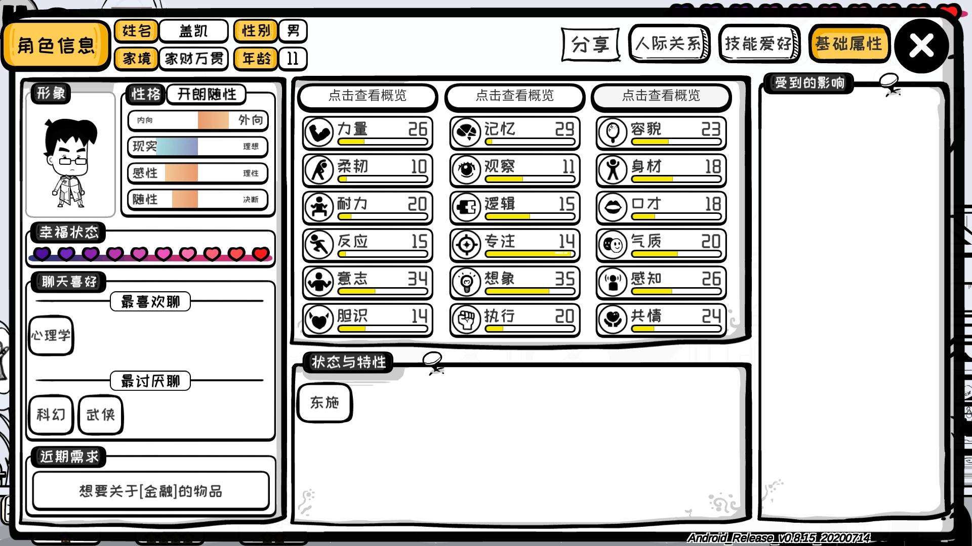 现在11岁了,这属性见鬼了,学什么属性成长都不高,就外语和文字不掉娱乐,其他还有个别学一半就会掉。请问这要怎么玩,这游戏太难了,还有那个近期需求是什么作用