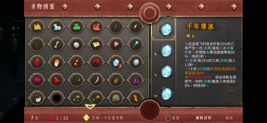 武器和圣物封印,就是耗费5个红玉,然后让被封印的武器或者圣物不会在游戏内出现,以此来达到减少不想要的武器和圣物的目的