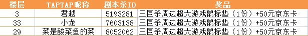 在本贴评论区发布《剧本杀》TapTap游戏评价区的评论截图,并留下剧本杀中的ID(游戏ID是一串数字哦),即有机会赢取京东卡、三国杀盲盒公仔、【剧本杀】 迷你实体微剧本等【剧心动计划】限定奖励(听说走心评价得奖几率更高哦)
