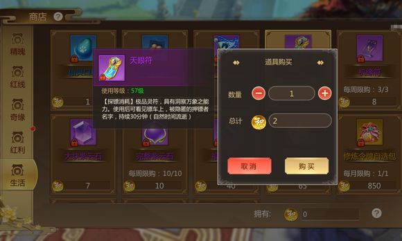各位蜀友是否觉得每周2次劫镖不够过瘾?生活积分商店新增了道具【机缘符】,使用后可增加一次劫镖次数,每周可购买3次。这下,一周最多可以拦路打劫5次了!劫到绝世镖的机率又增加了,嘿嘿~