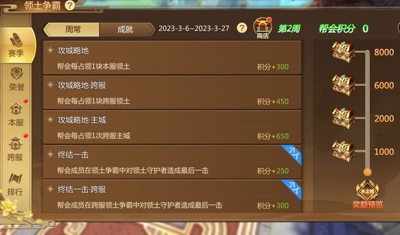 为了给大家减负,领土争霸赛季任务积分要求下调了,第2档积分由3000下降至2000,第4档积分由9000下降至8000,奖励依旧不变,这样更容易获得奖励了。