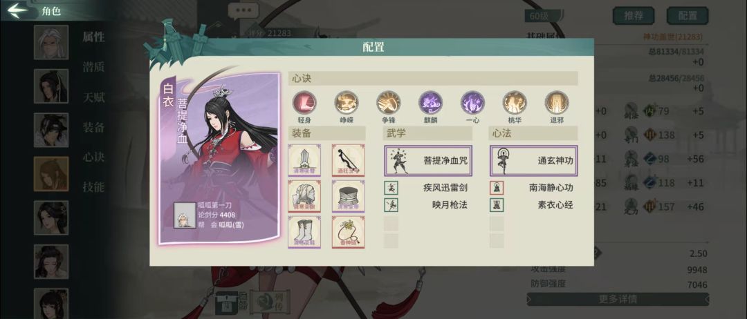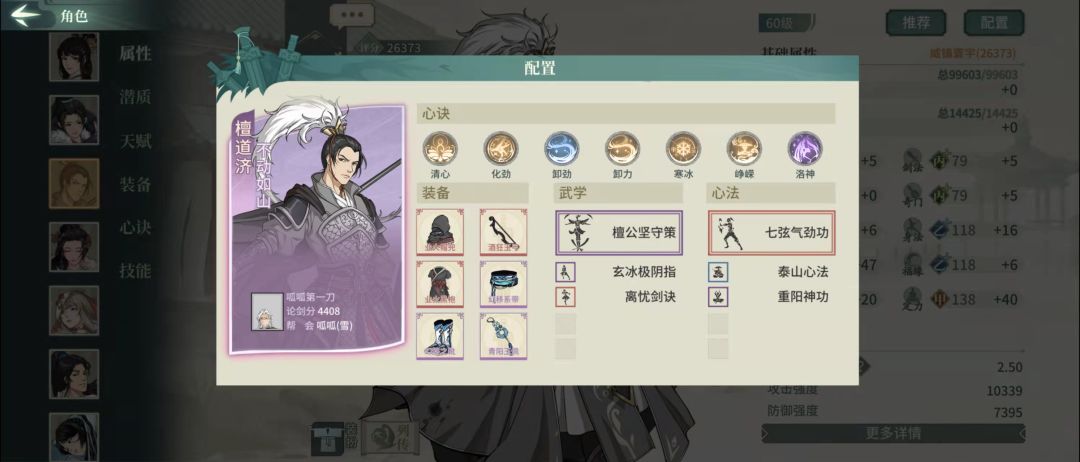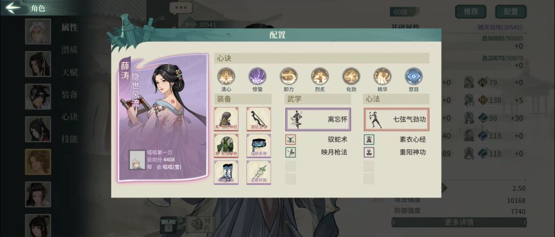 也是比较常规的配法,作为拿不到白衣时的替补,或者对抗闪避侠客、遁甲的策略卡。特别注意的一点就是我的饰品稀有词条刷的是回复生命,因为这个配置的薛涛本身有170左右的高抗性,比较少吃到负面,也就不存在移除减益的需求,选用回血提升持久作战的能力。洗练可以一根骨一悟性,也可以双根骨。