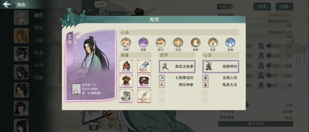 太极王家王维,平平无奇,王维配法很多,但是我还是觉得王家是最好用的,饰品洗蓝量、根骨、命中、点穴、封穴,不要内伤,腰带注意刷个稀有词条品质高的(我的是20%概率、距离3、3级、2回合,以供参考)