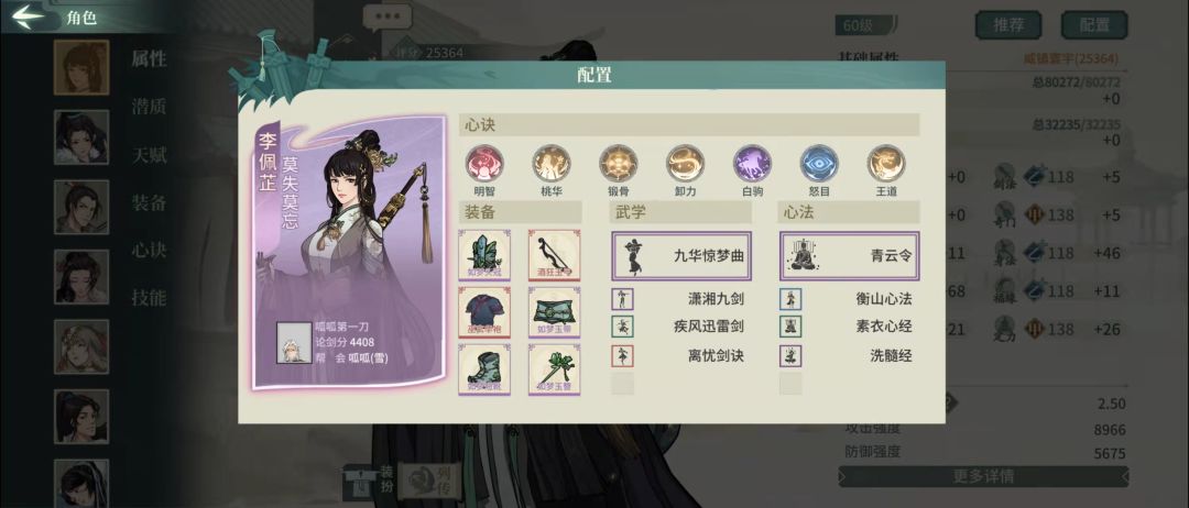 一个高速、中速发挥都很不错的青云师姐配置,缺点就是怒气不够稳定,但是如梦套、概率满减伤、青云、白驹,这些配置给了师姐中速辅助作战的能力。毕竟本身很难选到,只能退而求其次使用替补配置。洗练一身法一悟性。
