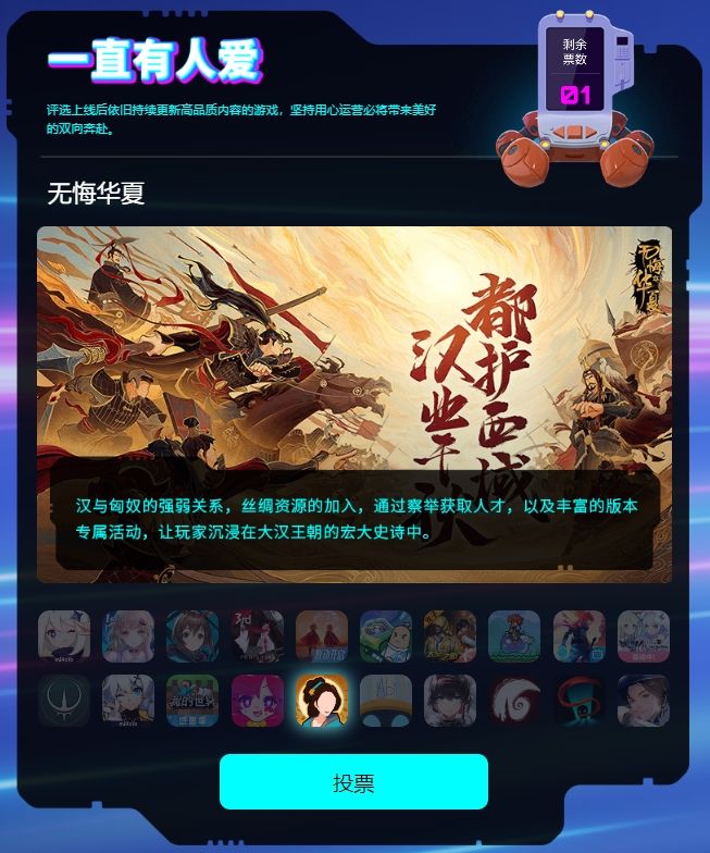 在奖项揭晓前,各位王上还可以参与“2022年度游戏大赏-玩家奖项”投票活动,为《无悔华夏》投票,助华夏摘冠哦~