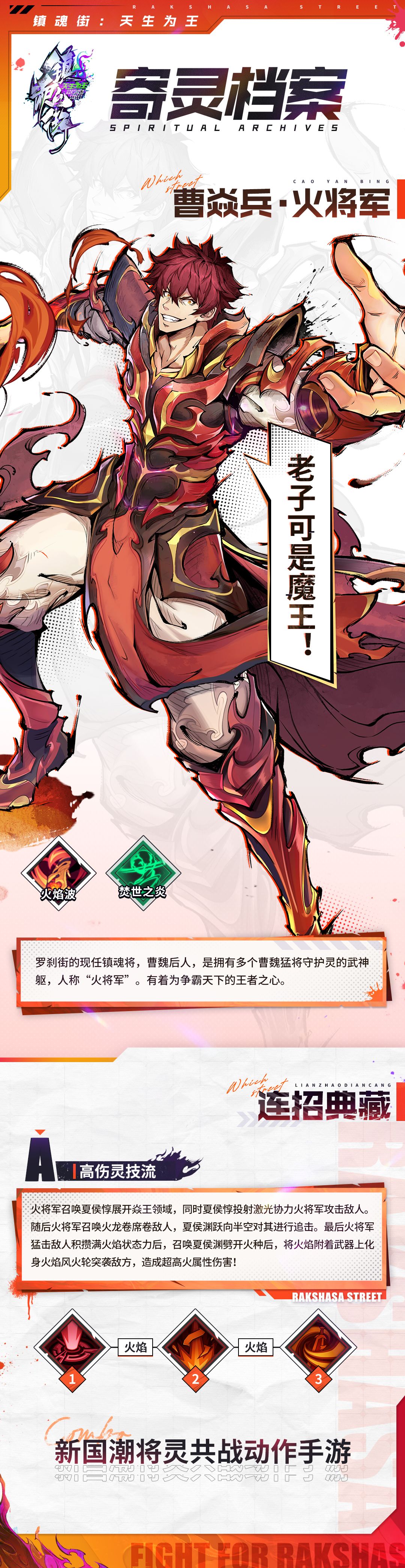 Heyyy bro!!很高兴新的一期寄灵档案又和大家见面了,今天我们要认识的主角是自称魔王的曹焱兵·火将军,走出罗刹街的火将军无论是在为人处世还是对敌作战上都有了很大的改变。所以四通也想让bro们更加深入的了解初出茅庐的曹魔王是如何一路升级打怪并越变越强的。