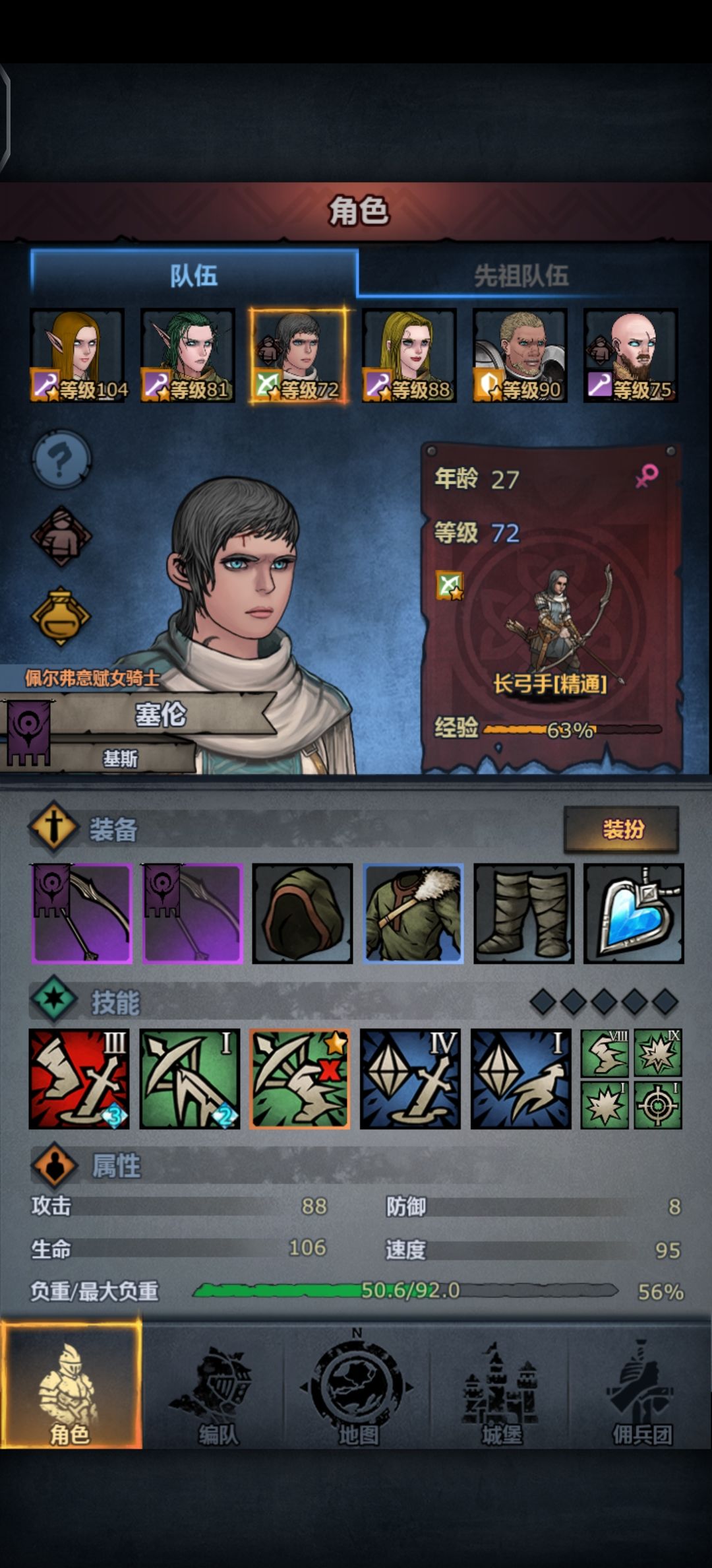 ⑤现在有了65级、嗜血4、屠杀2的刺客了,转职长弓,给他装备有磨锋5的红林弓,完成了。
