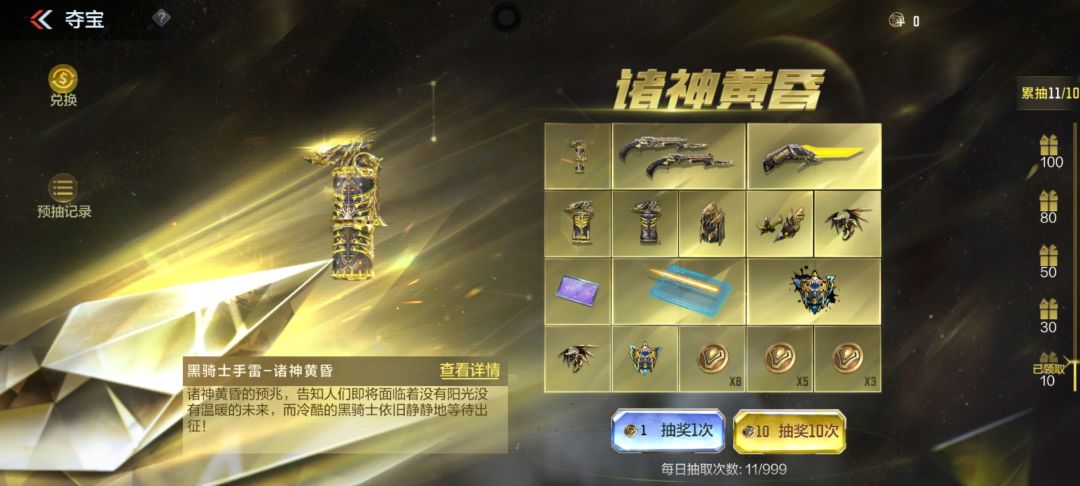 累抽十次可获得诸神黄昏头像累抽30次可获得冈尼尔断刃×5,累抽50次可获得冈尼尔断刃×10,累抽80次可获得英雄之钥×2,累抽100次可获得冈尼尔断刃×15。
