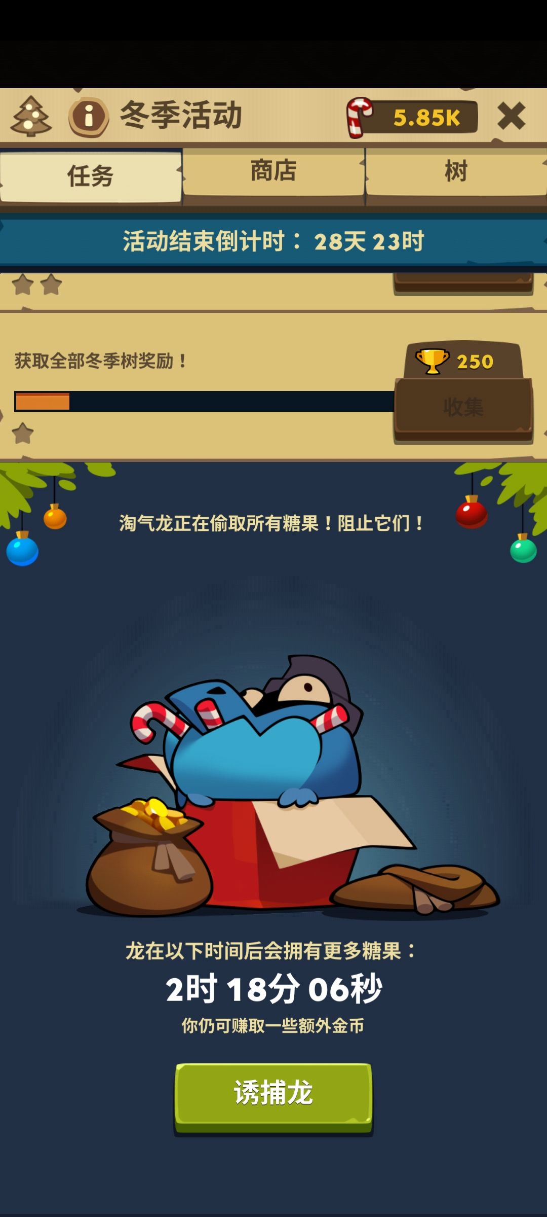 3.关于糖果获取:①淘气龙在冒险里刷新,3-5分钟(具体没有看),抓到后可以参与雪球大战,击打淘气龙会掉落金币和糖果,不想等的可以在节日任务下方直接看广告或者用筹码进入。