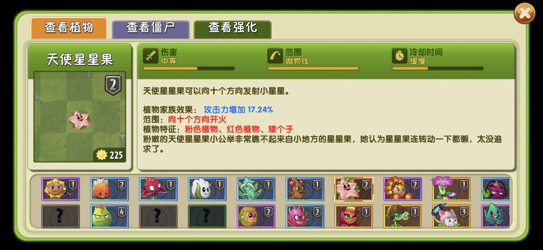 在无尽前期,讲究的就是速刷。常见的速刷为机枪豌豆。天使星星果有同样具有该能力,在部分无尽关卡中,天使的速度会比机枪快些。