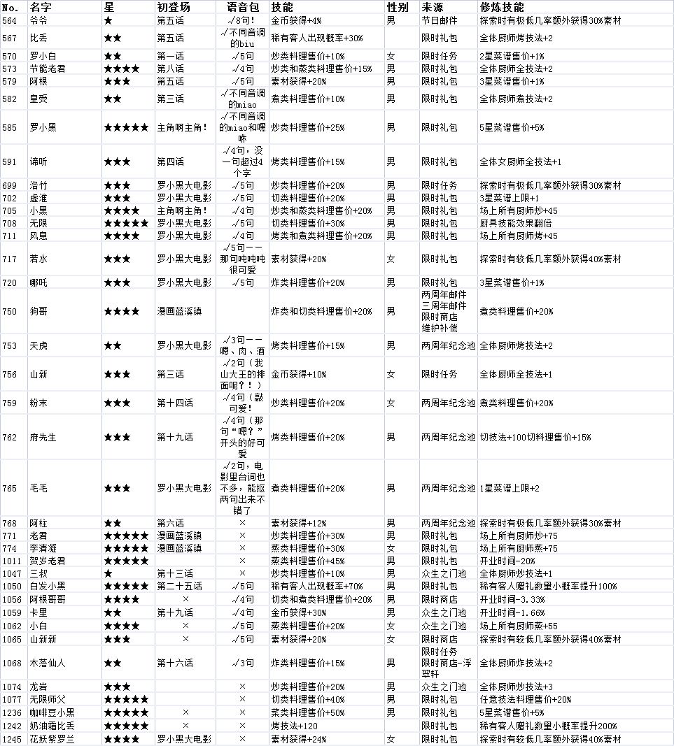 罗小黑系列的厨师有一大特色就是有语音包,这是别的爆炒厨师没有的,当然也不是所有厨师都有语音包,大家可以参考下面这张表格~