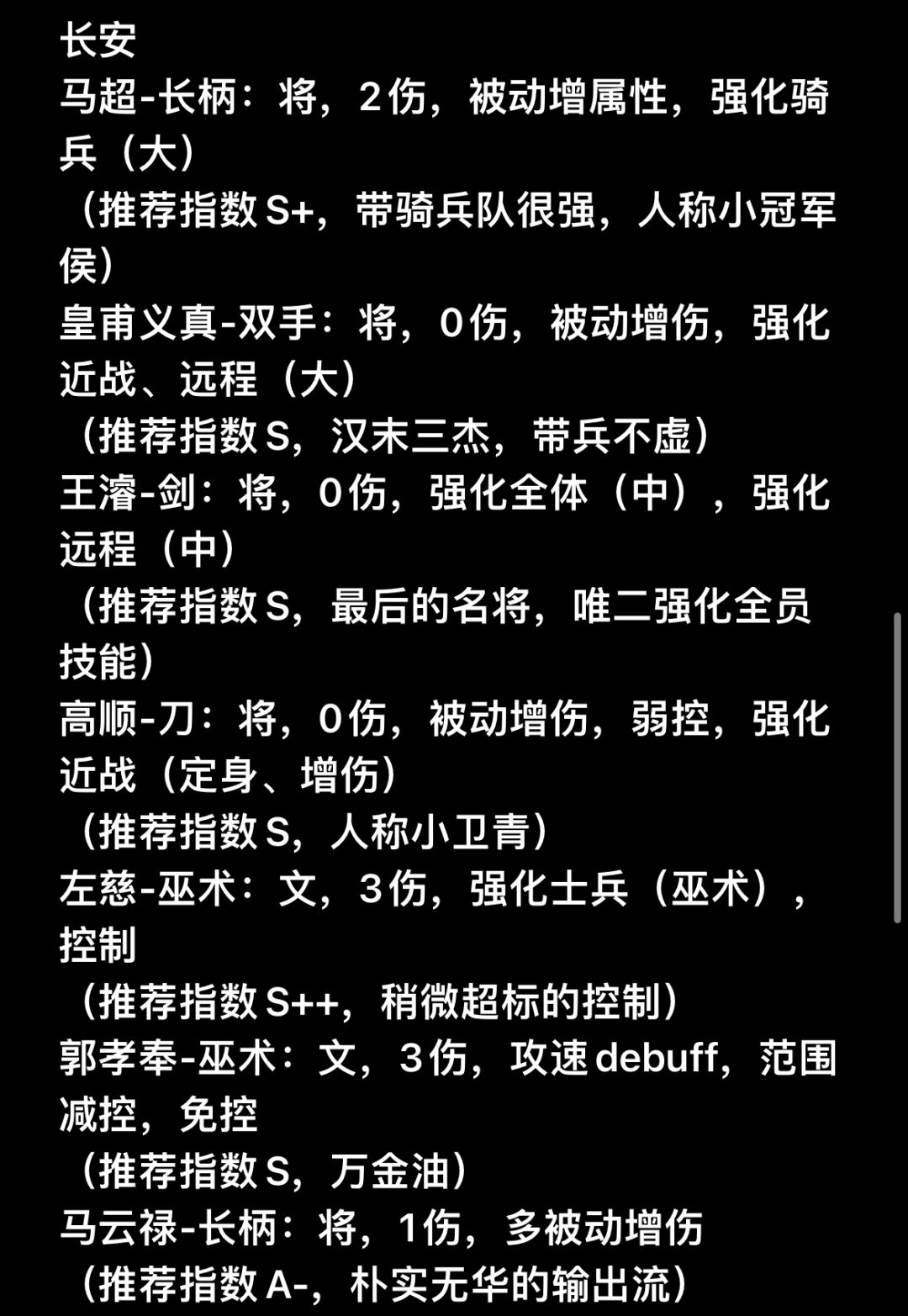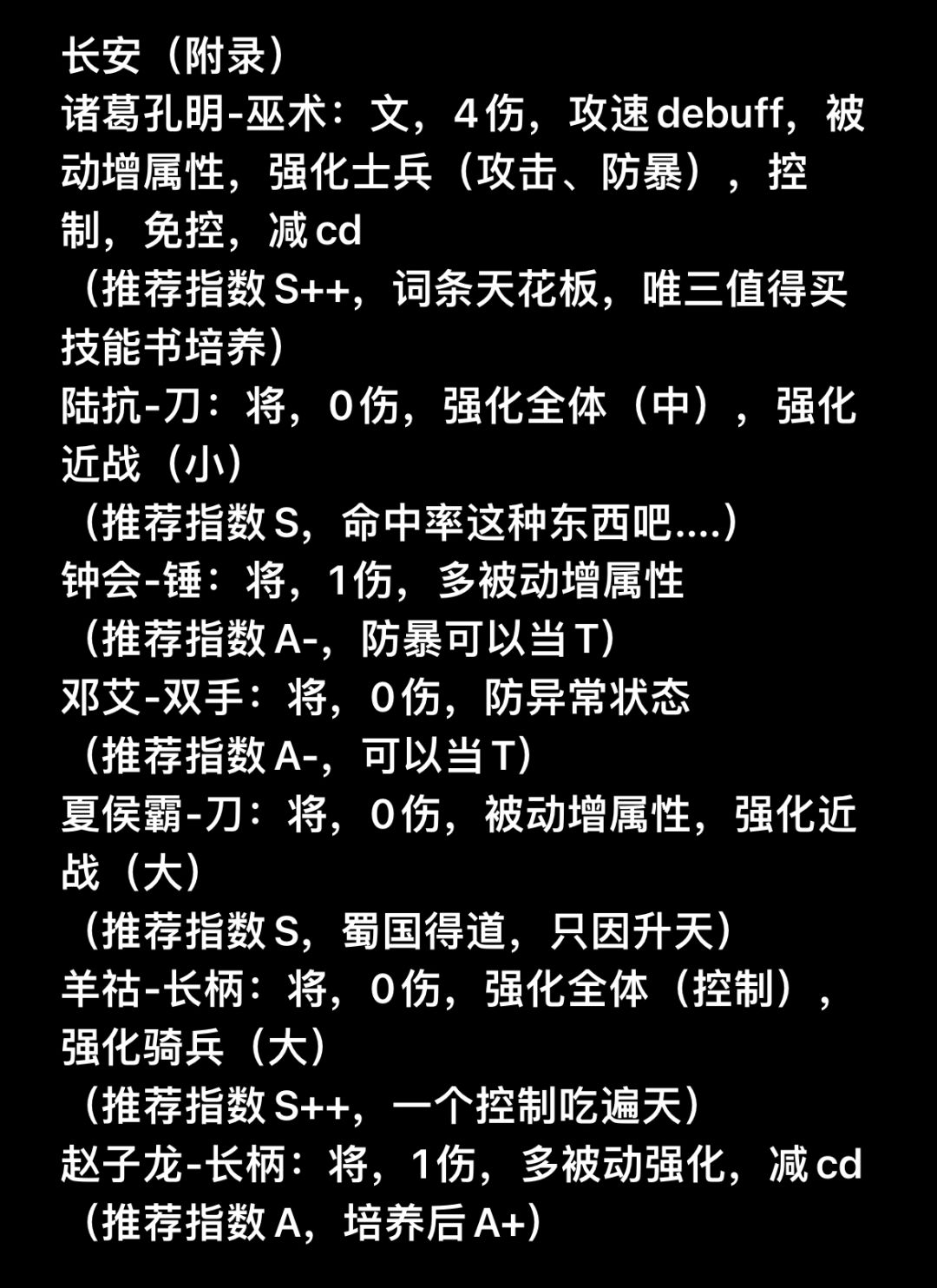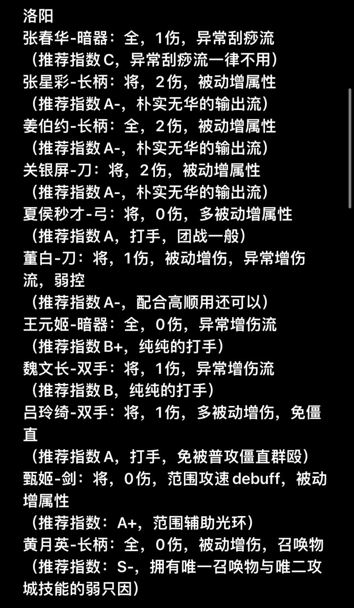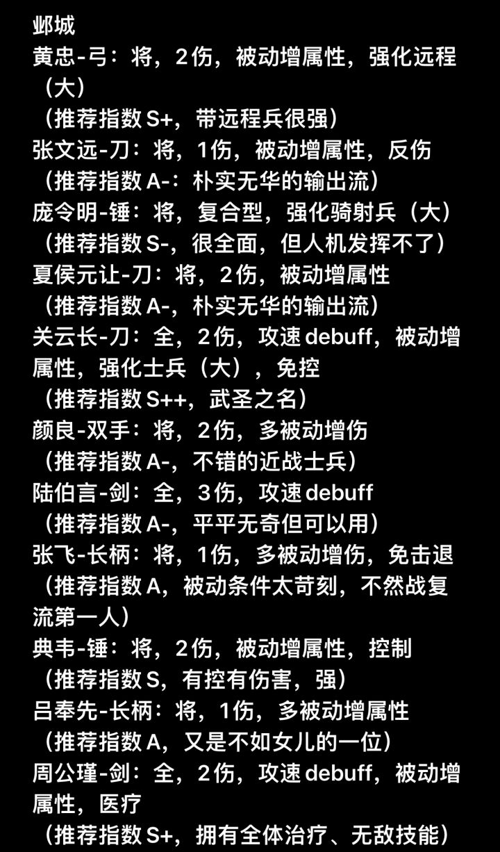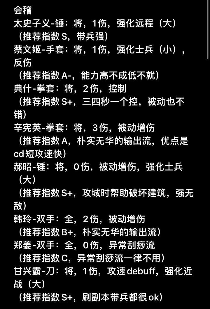 武将名-武器类别:官职类别(“全”即指“全能型技能页”),主动伤害技能数,被动词条(增伤、增属性),队伍强化buff和技能对敌debuff,特殊减免词条(免控、减伤、减cd),等