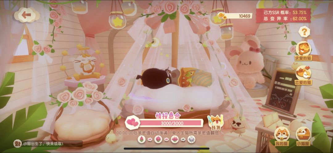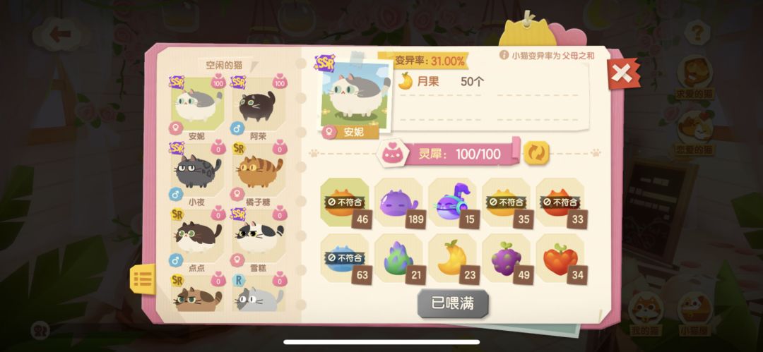 更新下情况,第三窝全变异,但是在意料之内,两只sr。然后买满了音乐果,音乐果拉满结果出了别的变异果的sr,意料之外么?不,在意料之内,虽然这只有2%概率,但是我是高氪金玩家,所以必须会在别的地方针对我,我相信在未来的10窝,也不会出所谓的“纸面概率”ssr变异的,毕竟氪金越多是越会被针对的(最后一张图为我和亲家62%变异率 53%ssr率 全变异果拉满结果)