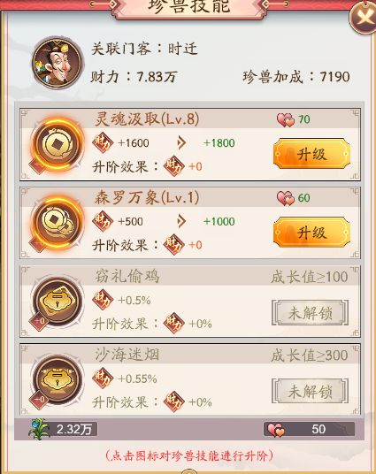 时迁的珍兽是黄二爷 ,他没有特殊的触发技能,只有4个普通的技能,都是增加财力的可以看一下。