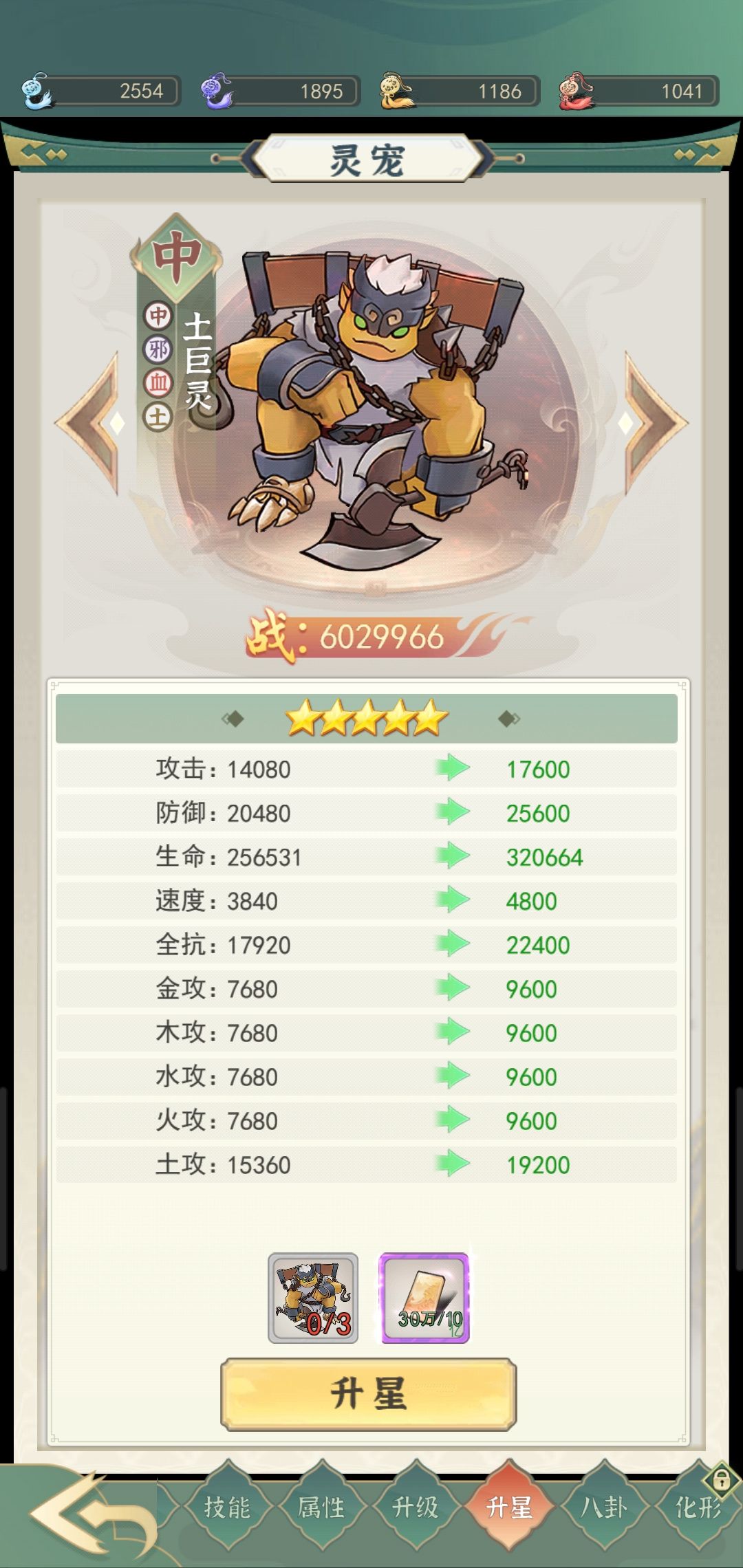 宠物养了一只血宠,一只攻击宠物,这个因人而异,大部分人可能都是土木巨灵,多买灵草升级,多扫荡材料,不然宠物升级慢。宠物技能优先削弱技能和群体增强技能。