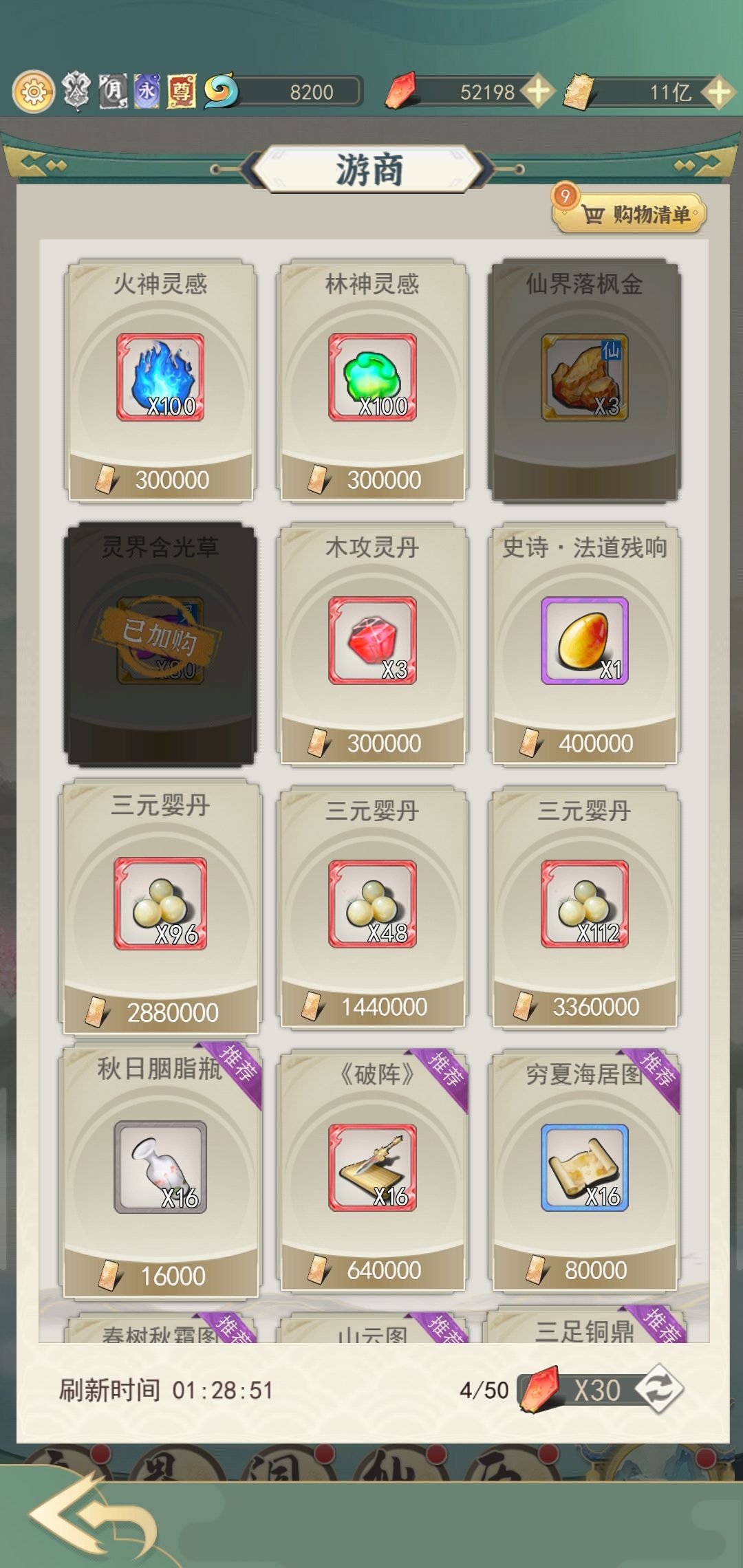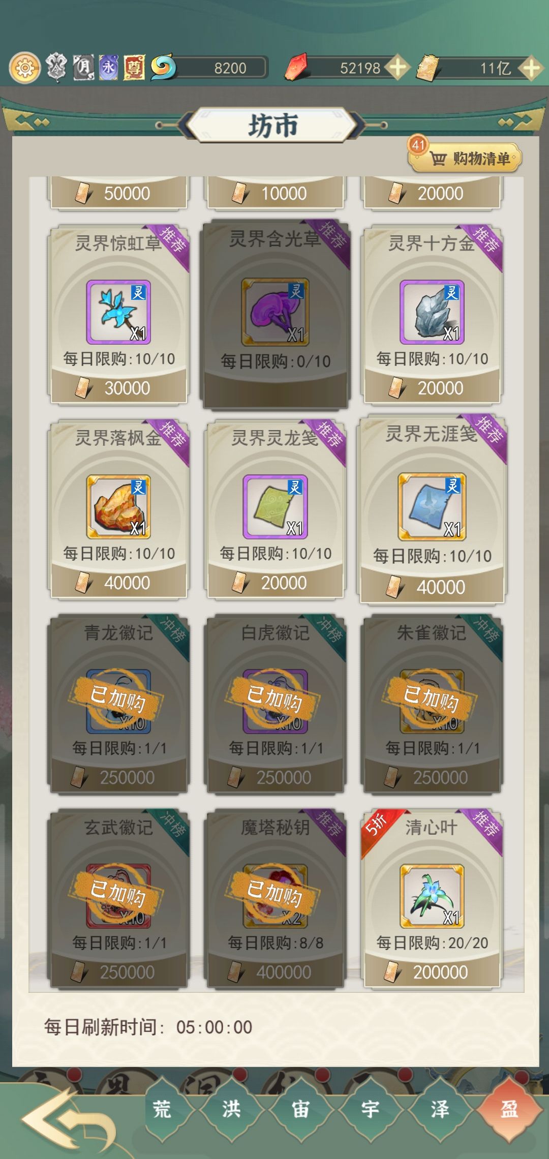 坊市和游商可以把物品加购物车,然后一键购买。游商建议购买宠物奇遇石,法相奇遇石,太清草,还有灵界含光草,每天把50次游商都刷完