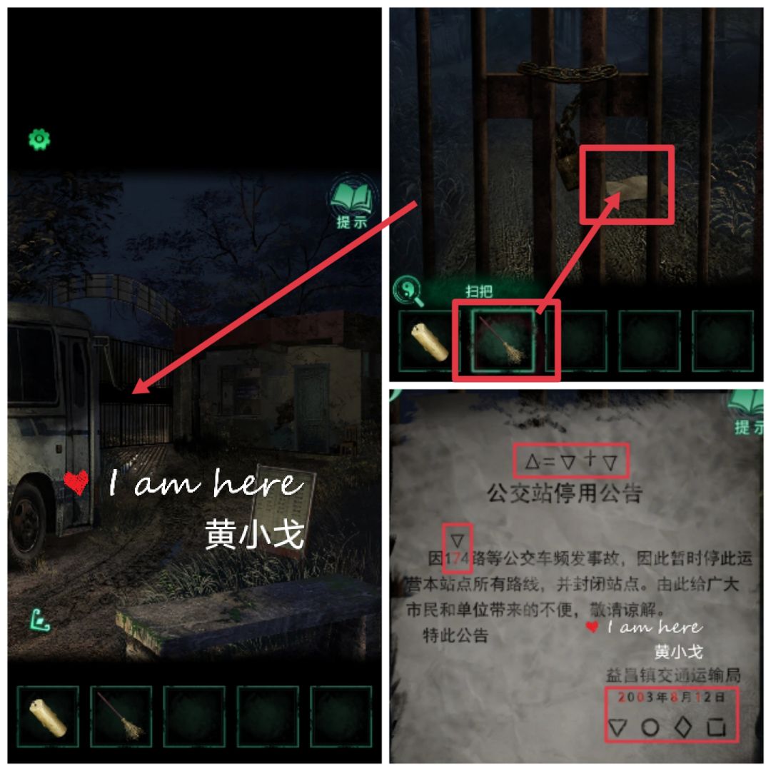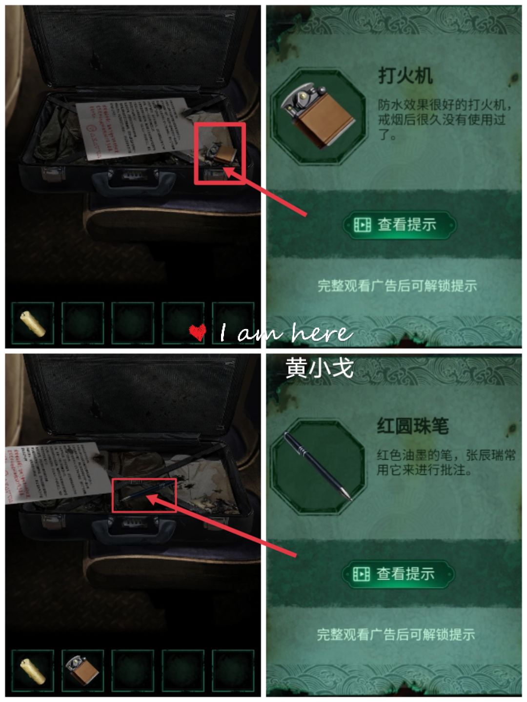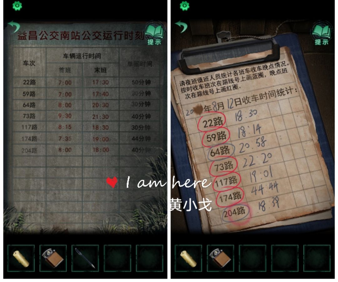 13.(公交车后座)点击座位上的行李箱,根据纸张的信息:△=▽+▽、▽=7、▽=2、○=0、=8、□=1 ,得到密码:0819,打开行李箱,获得【红圆珠笔】和【打火机】