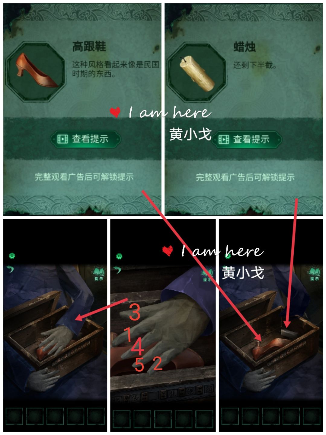 8.点击盒子中的物品,纸人的手盖住盒子口,根据公告牌的信息依次点击纸人的手指:31452 ,获得【高跟鞋】和【蜡烛】