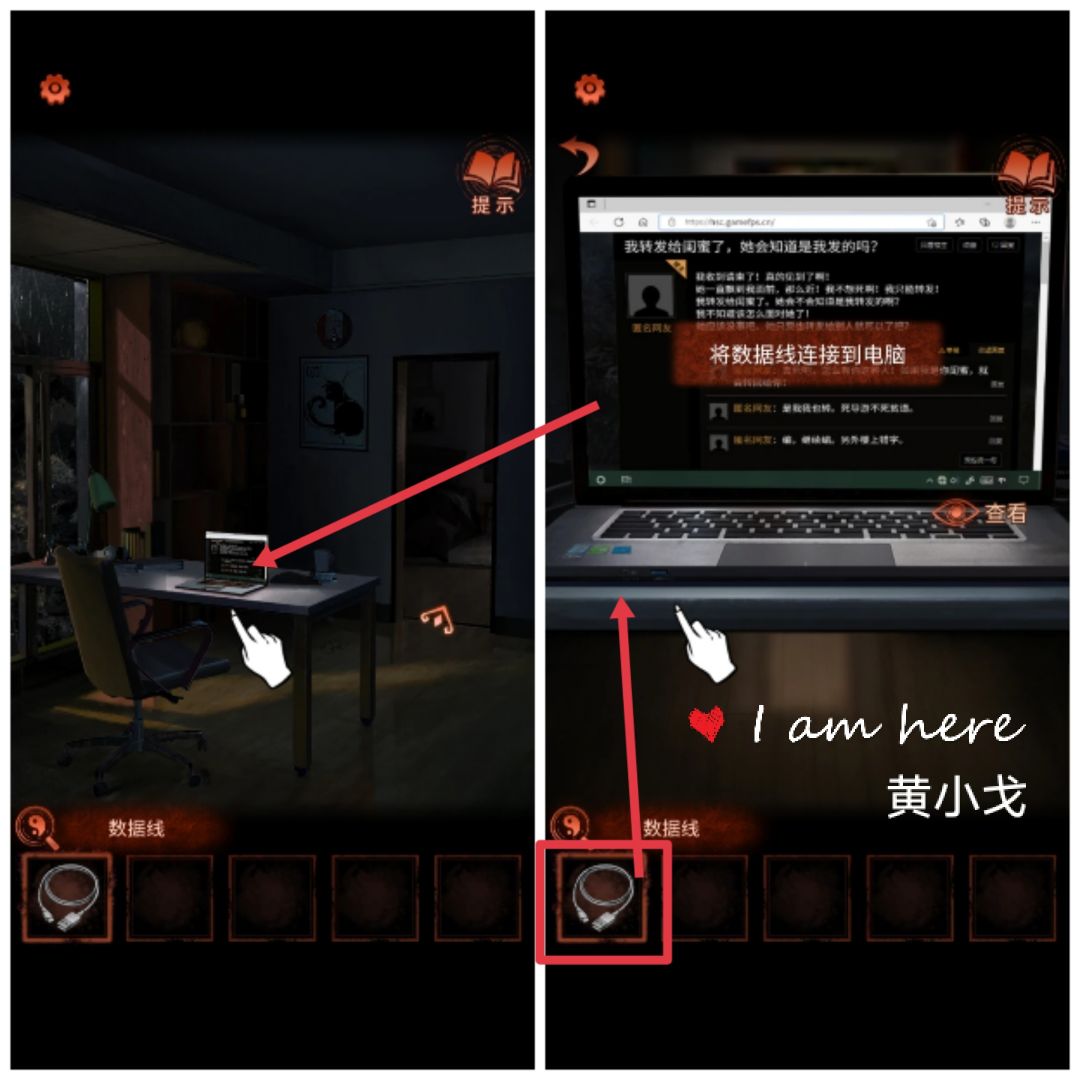 2.(客厅)点击书桌,将【数据线】连接到电脑(此处有小高能)