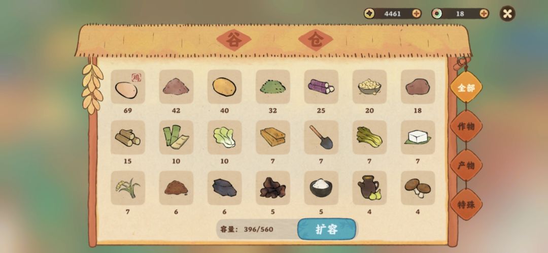 1.仓库问题。这个问题一直存在,反正不处理,氪金与不氪金的玩家都难受,仓库么技能升级可以一直升,一次30上限。还有仓库扩容,月卡,以及18元买的那个30空间上限值,其中月卡占大头,所以建议还是买月卡玩。目前我已经弄到560的仓库存储容量,暂时够用了,基本收入与支出平衡,且农田buff消失后,农田产量就会变少了,仓库也就堆不起来了。不过对于囤囤党很不友好。😏😏