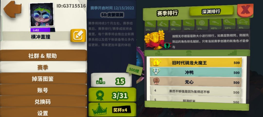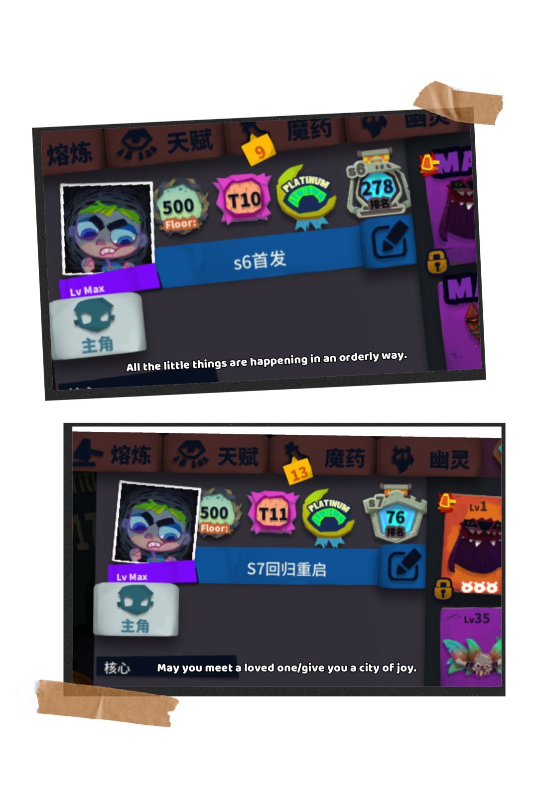 从s4开始接触的独奏,第一个号是渠道服,通关后换手机搞丢了号就没了,s5开始玩了现在的tap号直到现在,从s6开始有了排名,从两百多,到七十多,再到现在的15,要不是开服时间在周四,感觉还是有机会冲一下前十的,小可惜一下。