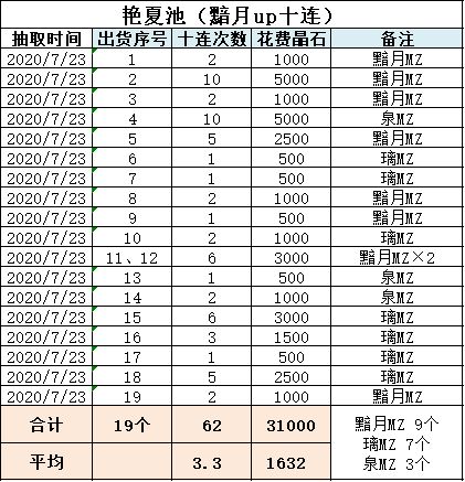62发十连,共花31000石,出货19个,其中黯月MZ 9个、璃MZ 7个、泉MZ 3个。