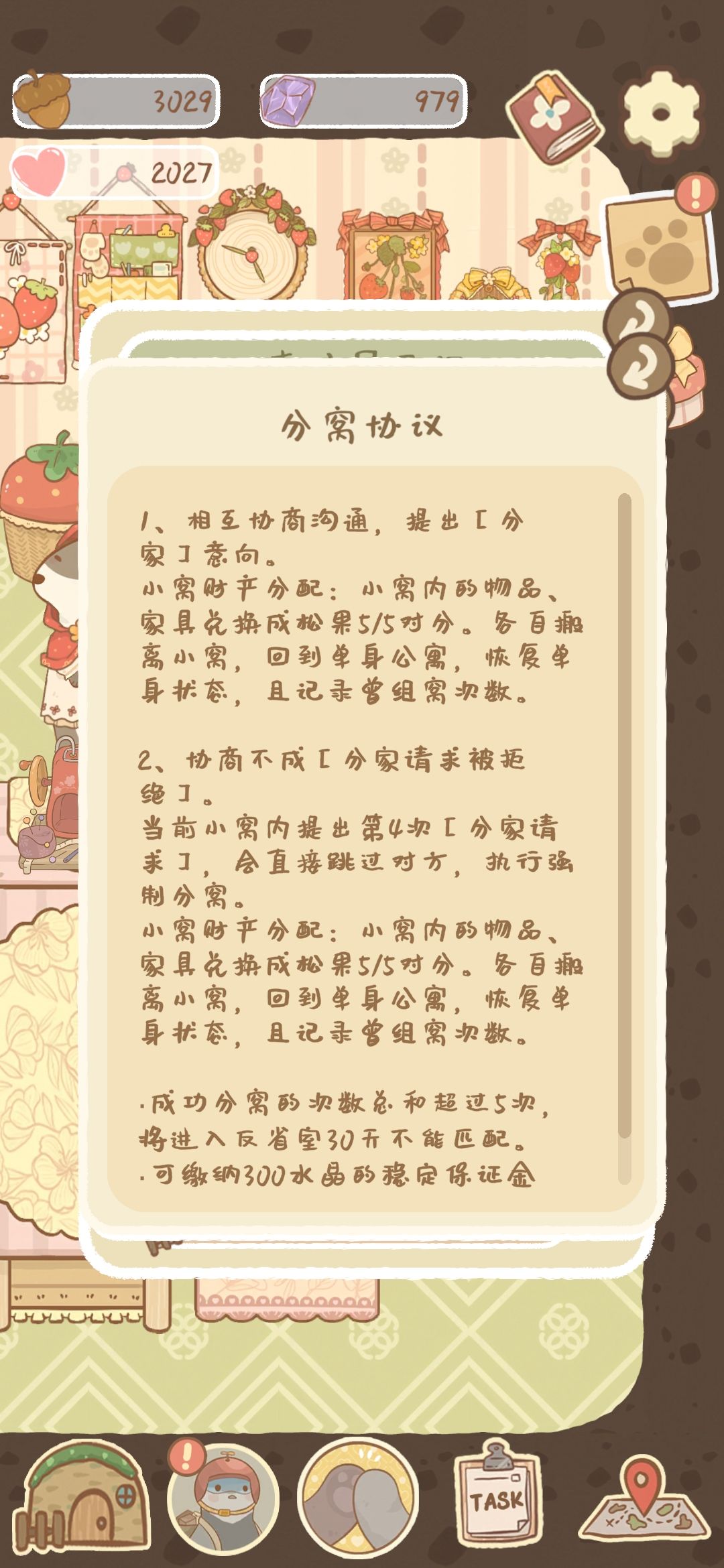 本帖只是想吐槽一下分窝机制,本人是打工鼠。12号随机匹配了一只鼠组成家庭,然后她就再也没上线过(也许上线了,我没看)。我曾经试图留言询问,石沉大海。然后我就准备分窝了,分窝请求持续3天,然而她都不上线了,显而易见我的分窝请求被拒绝。![[嗒啦啦4_迷惑]](https://img.tapimg.com/market/images/8cc4c9c02fa0da4e9d60c74766c65447.gif)