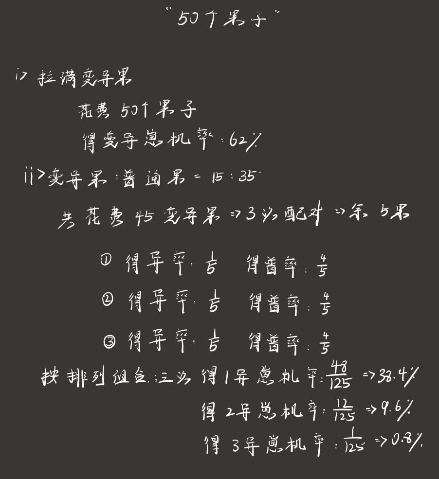 首先让我们设想一下,如果我们有50个变异果子(具体计算及推演看图片)