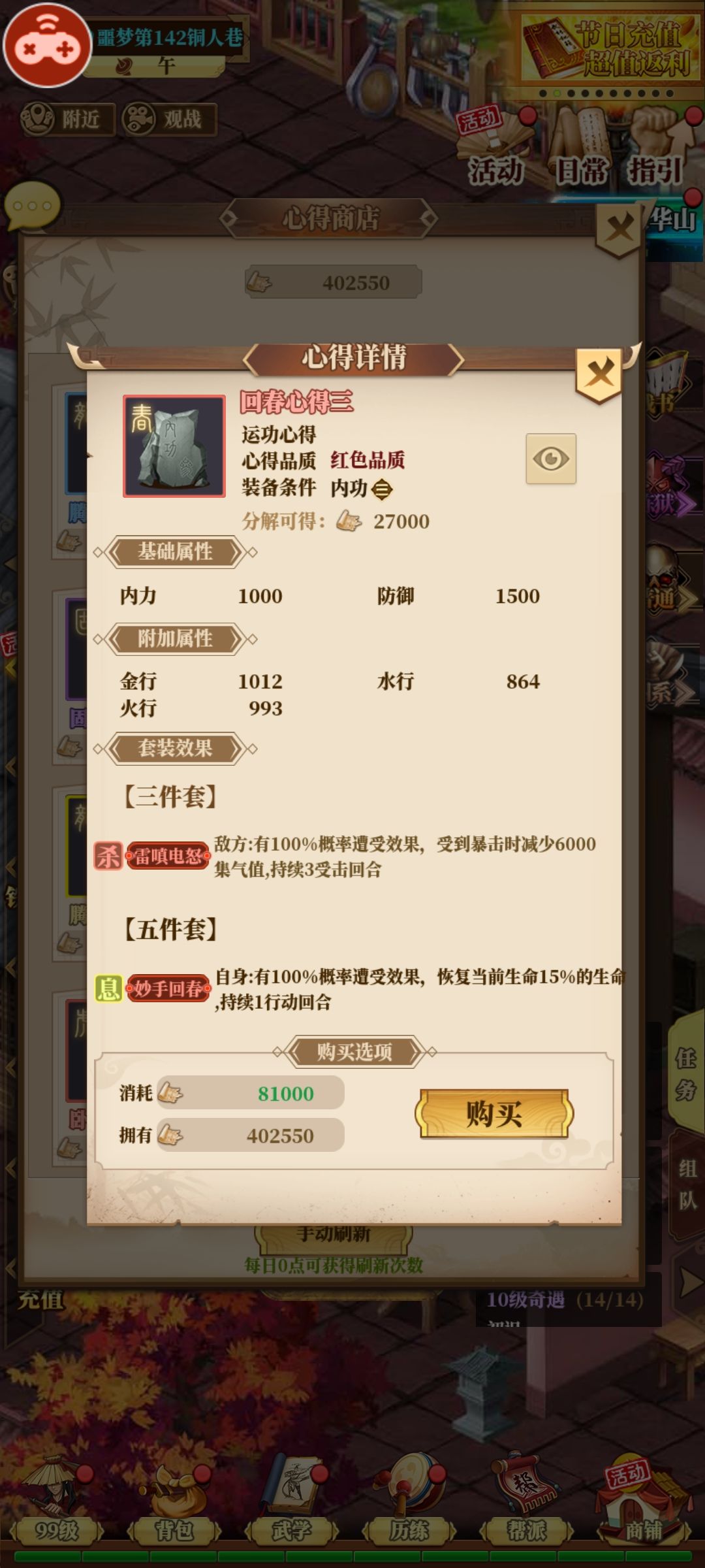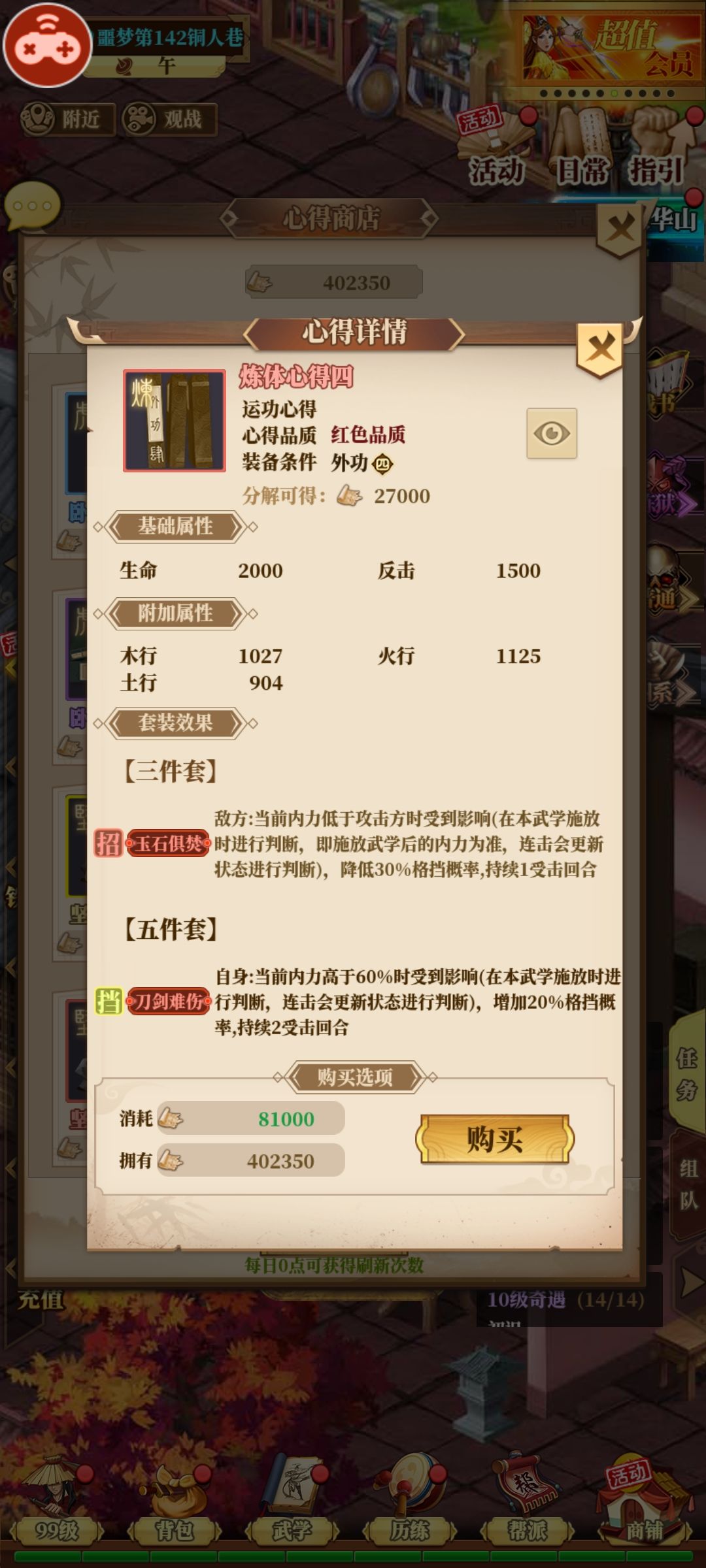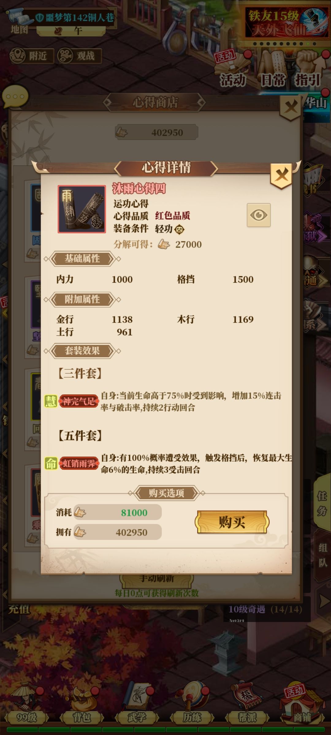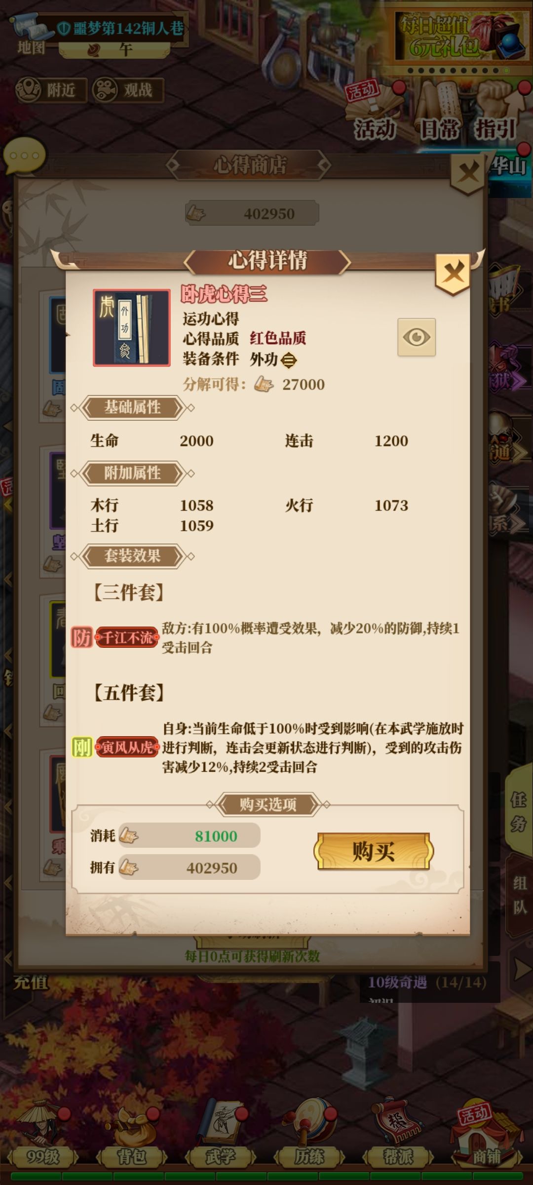 两个内功心得用回春(回血),两个轻功心得用沐雨(格挡回血),两个外功用炼体(加格挡),另两个外功用卧虎(减伤),至于其他的都是攻击向心得,或者效果不好,其中:①炼体挨着沐雨放置,保证沐雨可以吃到炼体的效果,提高回血概率②买心得直接买红色的,且属性要求必须有木行和土行,且接近满值,因为我们五行主要就是做土行和木行。