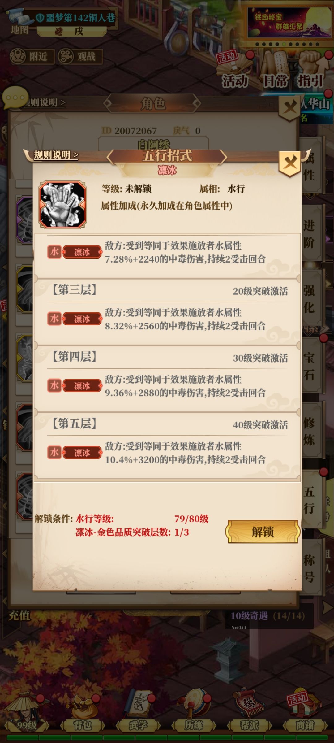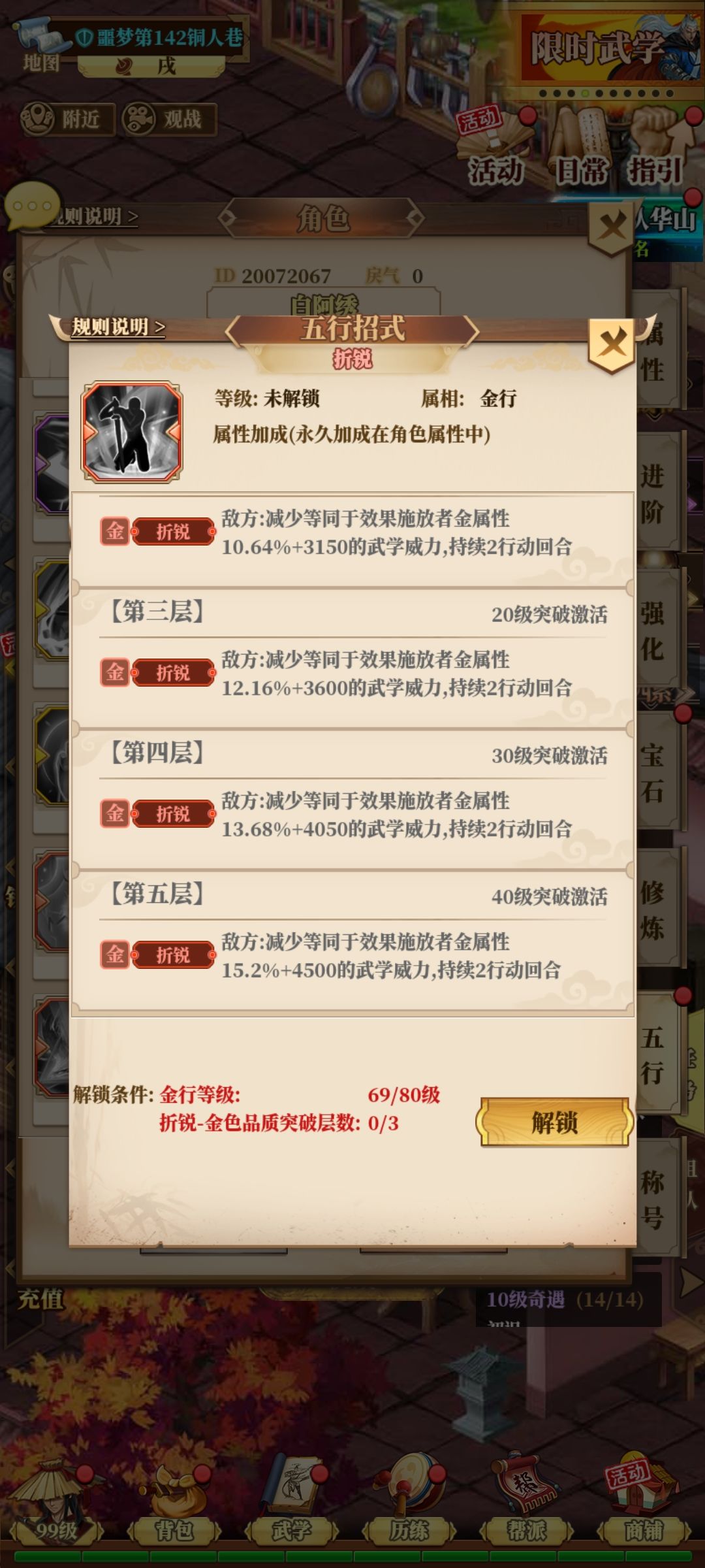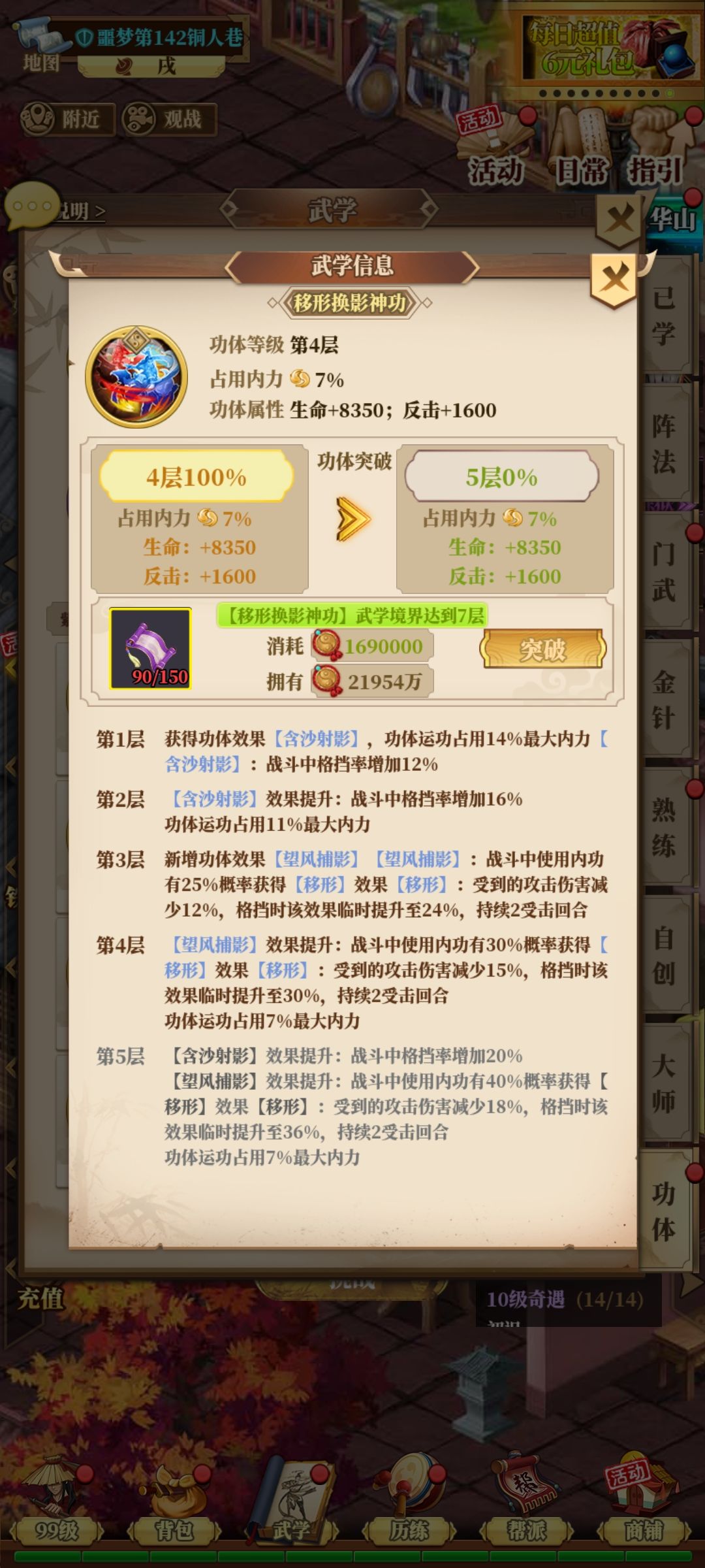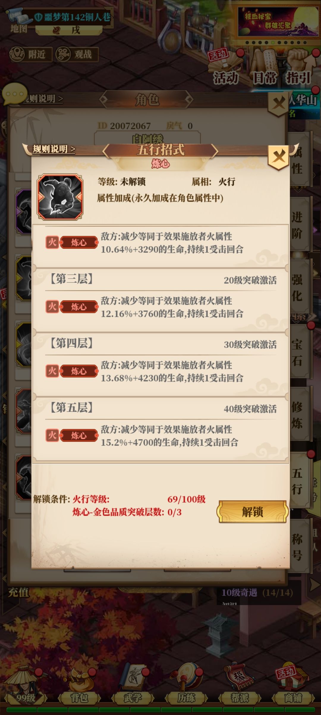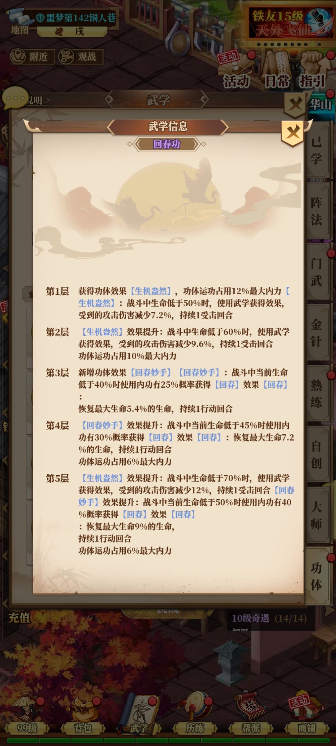 两个内功心得用回春(回血),两个轻功心得用沐雨(格挡回血),两个外功用炼体(加格挡),另两个外功用卧虎(减伤),至于其他的都是攻击向心得,或者效果不好,其中:①炼体挨着沐雨放置,保证沐雨可以吃到炼体的效果,提高回血概率②买心得直接买红色的,且属性要求必须有木行和土行,且接近满值,因为我们五行主要就是做土行和木行。