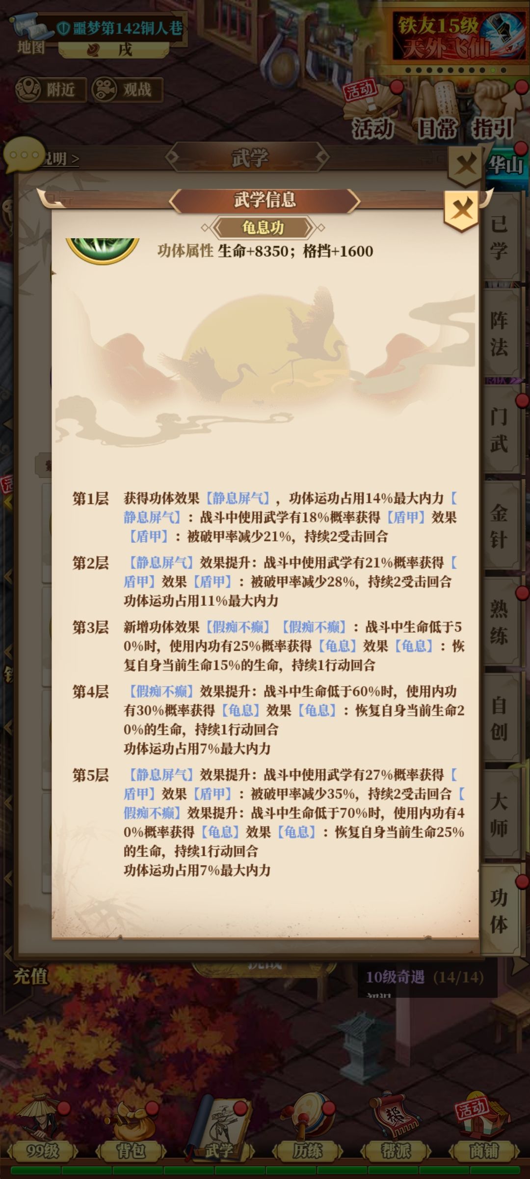 对于反伤来说反伤最重要,其次回血,其次格挡,最后压制一下对方的连击伤害,因此功体选:①上天梯(加防,反伤)②回春(回血)③龟息(回血)④移形换影神功(格挡)⑤星踏功(减连击率)⑥错身步(减连击率)