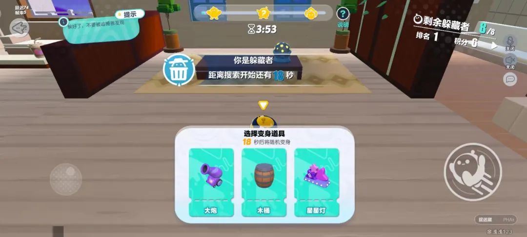 2.追捕者追捕者相对轻松点,没那么时时刻刻提心吊胆,而且还有扫描技能,直接开探测周边物品方便找到躲藏者。一般来说就是找地图中的bug,就是一些摆放不合理的物品。哪些跟其它东西在一起歪着的,单独突兀摆着的东西多看看。扫描技能就对那些房间里怀疑的敌方,还有物品堆放的敌方仔细查验。