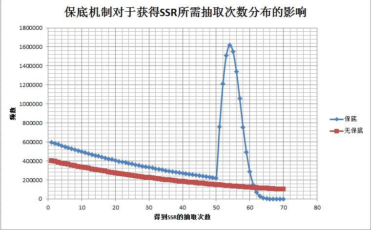 (注2:无保底抽取的SSR数量本身比保底就要少,如果按比例换算无保底的曲线在50发前会与保底重合)