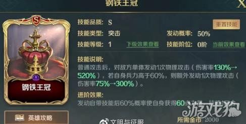 2、游戏内技能介绍:钢铁王冠:超高伤害突击技能,在自身兵力高于60%情况下,还可以额外发动一次攻击。进阶技能:发动自身技能时有60%概率获得60点力量,这使得腓特烈本来就超高的力量属性进一步提升,配合突击技能可以打出相当爆炸的输出。