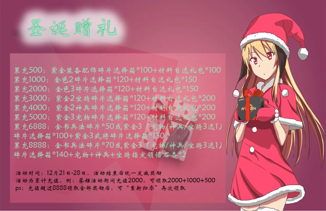 【活动说明】在活动时间内(12月21日-12月28日)累计充值达到金额可领取对应档位的大礼包哦,活动为累充奖励哦,充值高档位包含以上全部低档位奖励