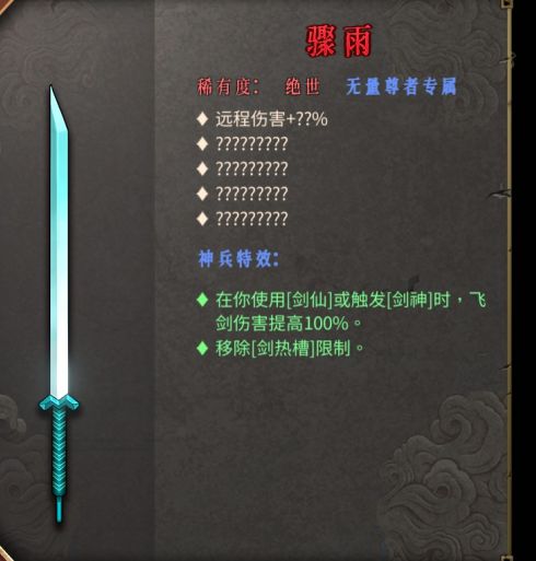 剑仙:清空你所有的剑热值,并在接下来的5秒内你的飞剑不再产生剑热值。